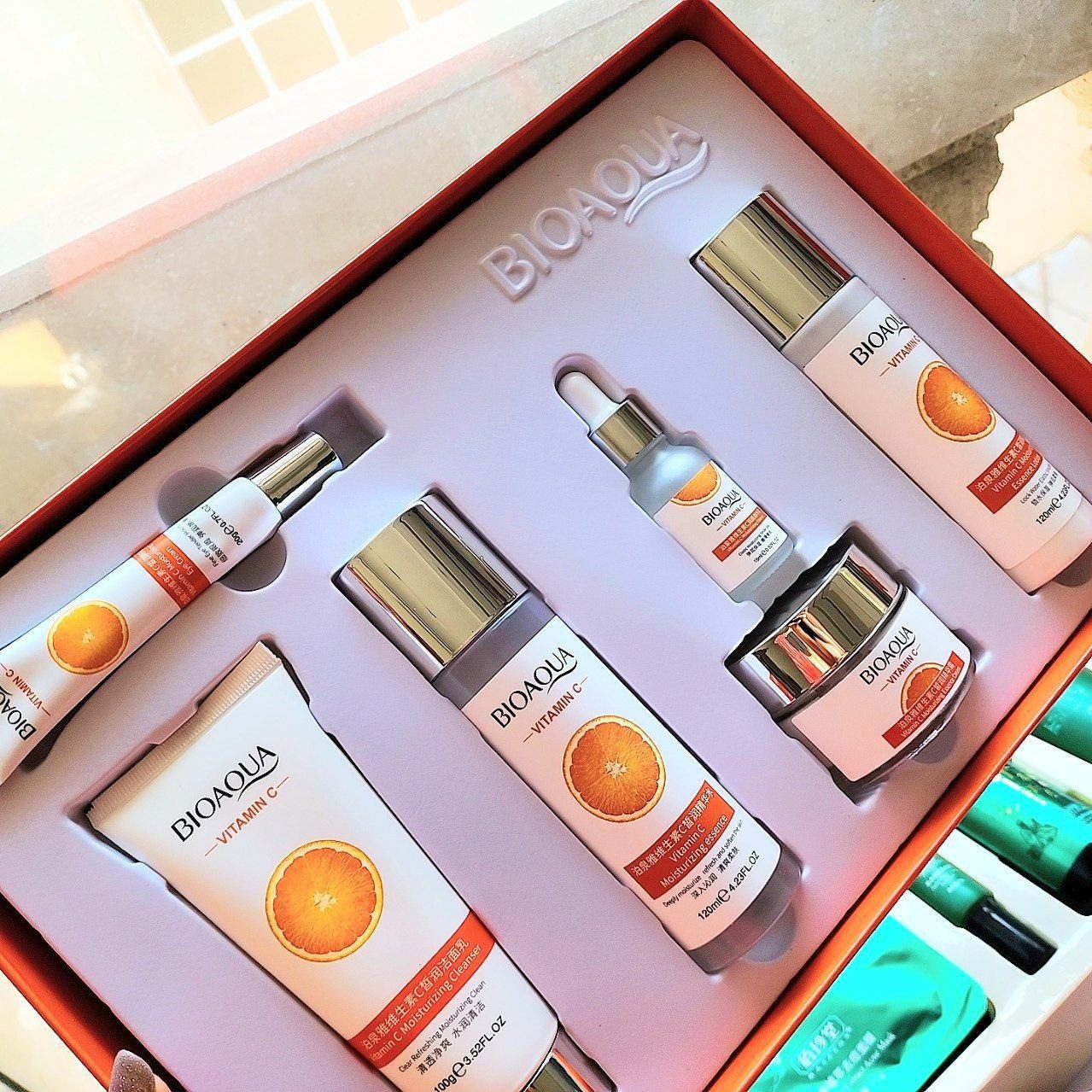 این پک که براتون اوردیم شامل تونر ، فوم شستشو، لوسیون صورت ،کرم دور چشم، کرم ابرسان، سرم هست و همشون محصولات ویتامین C هستن