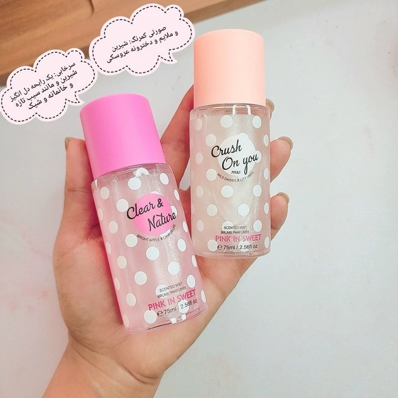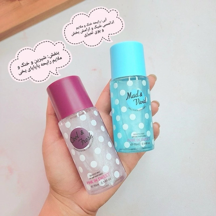 بادی اسپلش خالخالی Pink In Sweet اورجینال رایحه های بسیار عالی ماندگاری بالا دارای پخش بو جلوگیری از تعریق خنک کننده پوست بدن بادی اسپلش شاین دار قرمز: گرم و شیرین رایحه اسطخودوس و شکوفه های گل بنفش: شیرین و خنک و ملایم رایحه پاپایای یخی صورتی کمرنگ: شیرین و ملایم و دخترونه عروسکی آبی: رایحه خنک و ملایم ادامسی شیک و ارامش بخش و بوی تمیزی سرخابی: یک رایحه دل انگیز شیرین و مانند سیب تازه و خانمانه و شیک نارنجی: ملایم و شیرین، آبنباتی و وانیلی